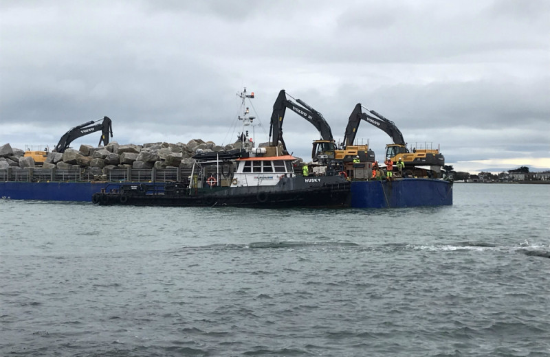 Alpha Marine's tug Husky has been retained to assist the Rock Dumping Barge Selina at the €10 million Euro Dun Laoghaire Baths redevelopment. Apart from restoring the original Victorian building on site, a new pedestrian walkway is being built between Newtownsmith and the East Pier aswell as a new jetty for small craft.