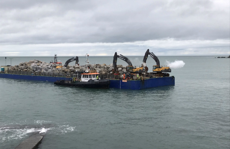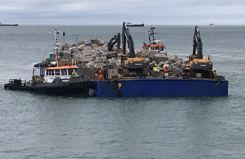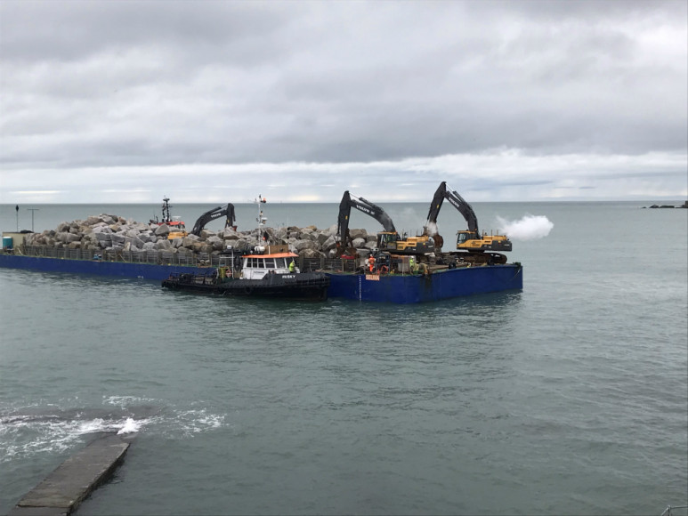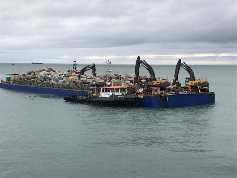 Husky with another tug, the MTS Indus has been moving the 6,000 tonne barge Selina into place so that her excavators can dump the rocks on the foreshore. The rocks, some as large as 6 tonnes, are then moved into place to act as rock armour so that the new jetty is protected from rough weather.