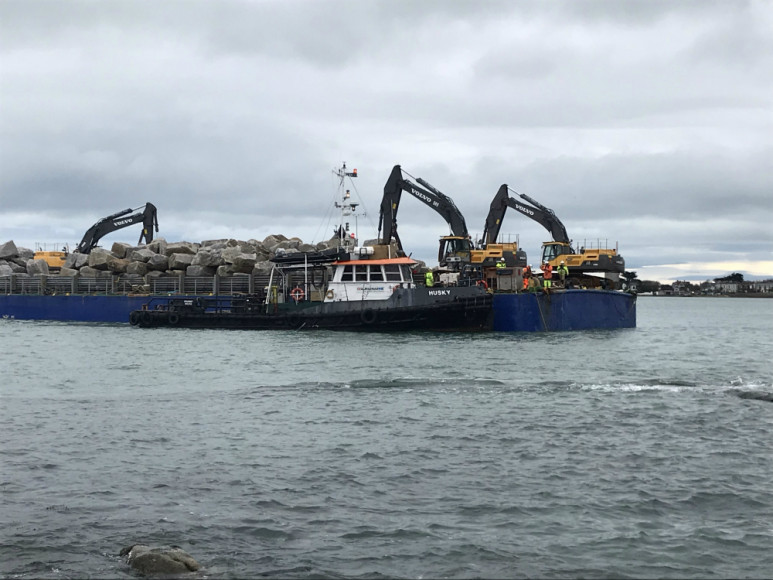 Alpha Marine's tug Husky has been retained to assist the Rock Dumping Barge Selina at the €10 million Euro Dun Laoghaire Baths redevelopment. Apart from restoring the original Victorian building on site, a new pedestrian walkway is being built between Newtownsmith and the East Pier aswell as a new jetty for small craft.